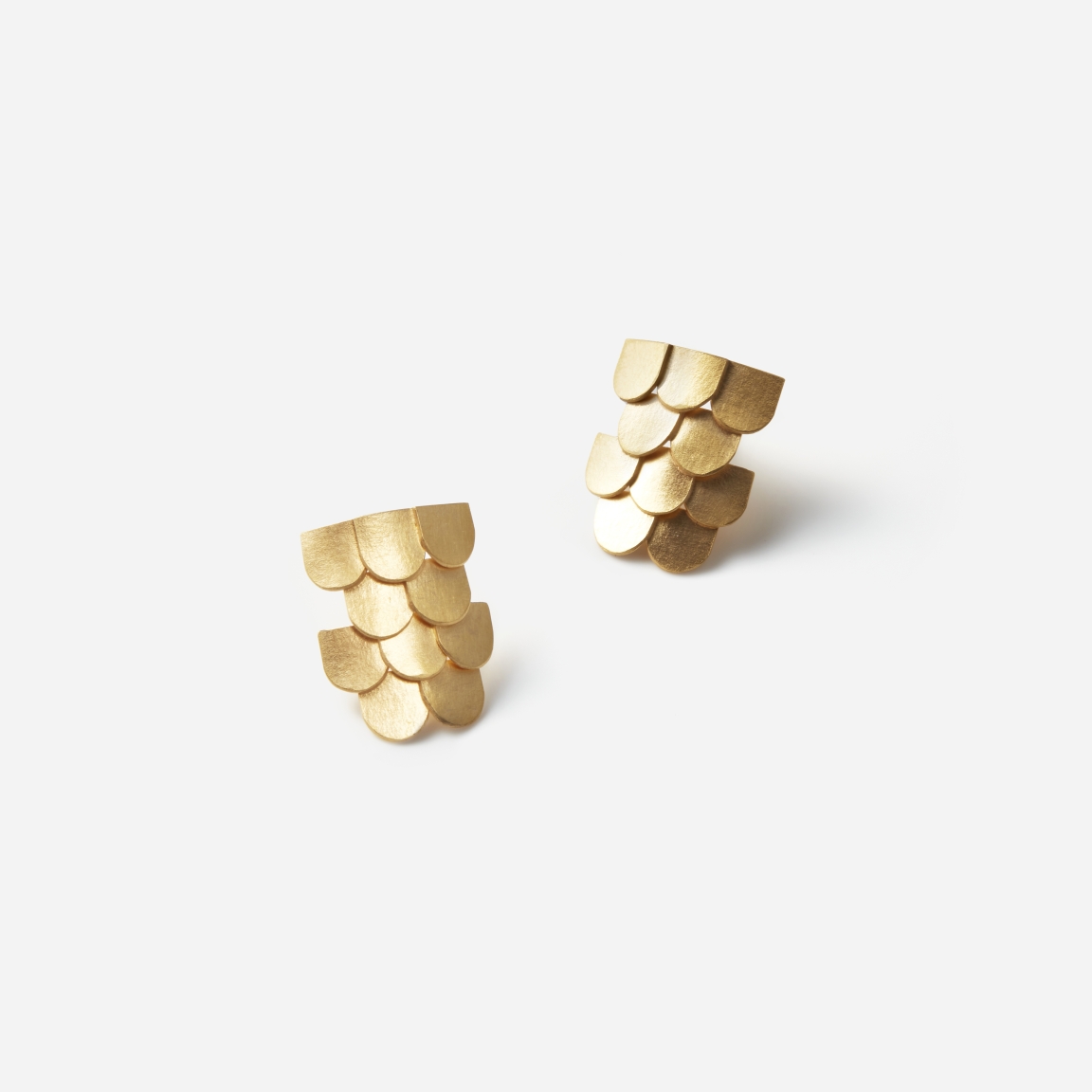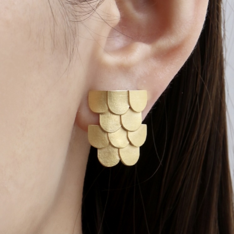 『丸い屋根』という名の通り、日本の瓦屋根の着想を得ながら柔らかな表情の金属パーツの集合体で表現されたピアスです。モチーフは一枚一枚丁寧にカットし重ねるように連ねられているので、単色でありながらも光が当たる度に、金属特有の陰影のコントラストがつく表情が感じられます。