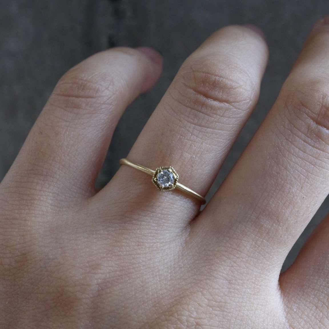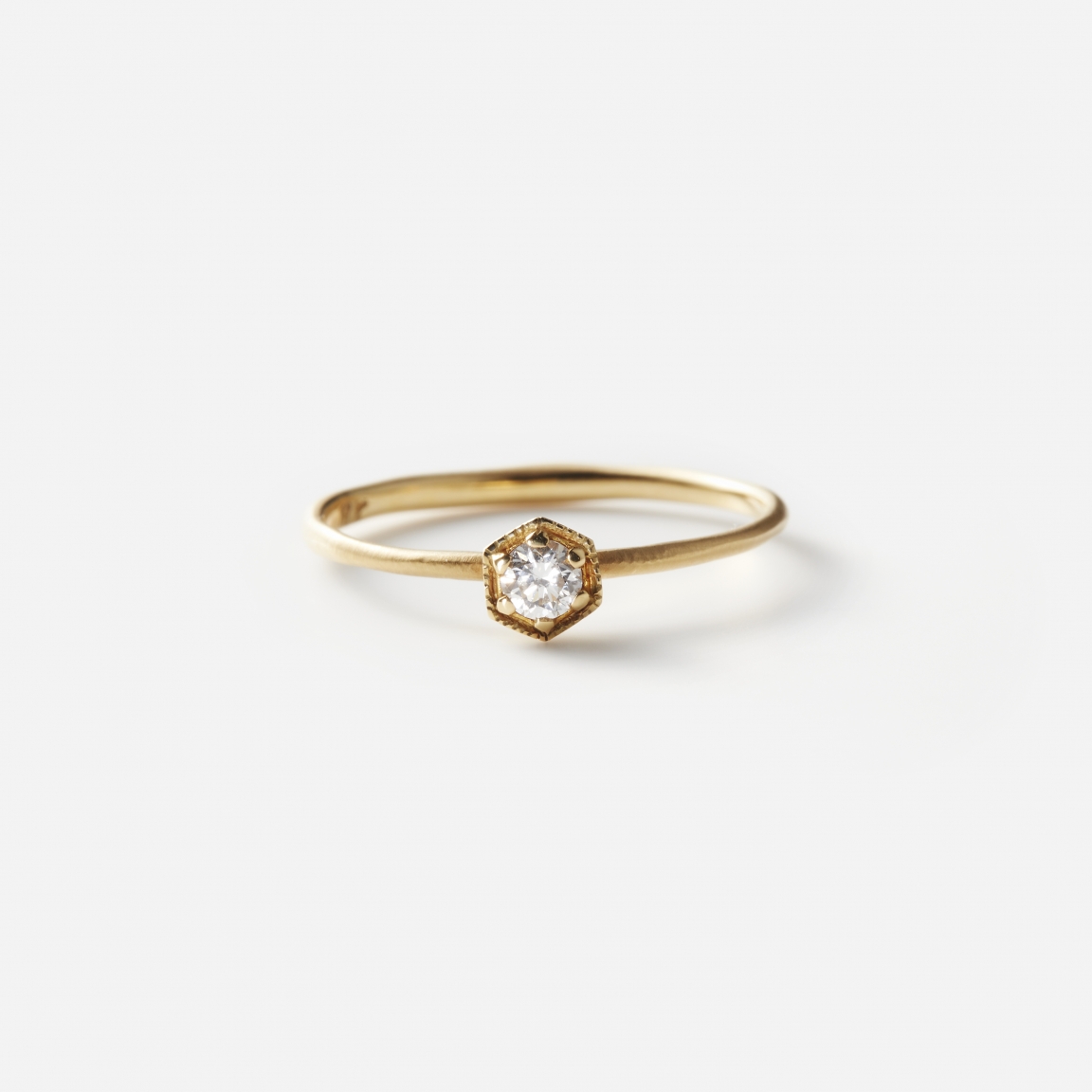 繊細に煌めくホワイトダイヤモンドを六角形の台座にセッティングした、ブランドのアイコンともなっている"Hexagon Ring"。