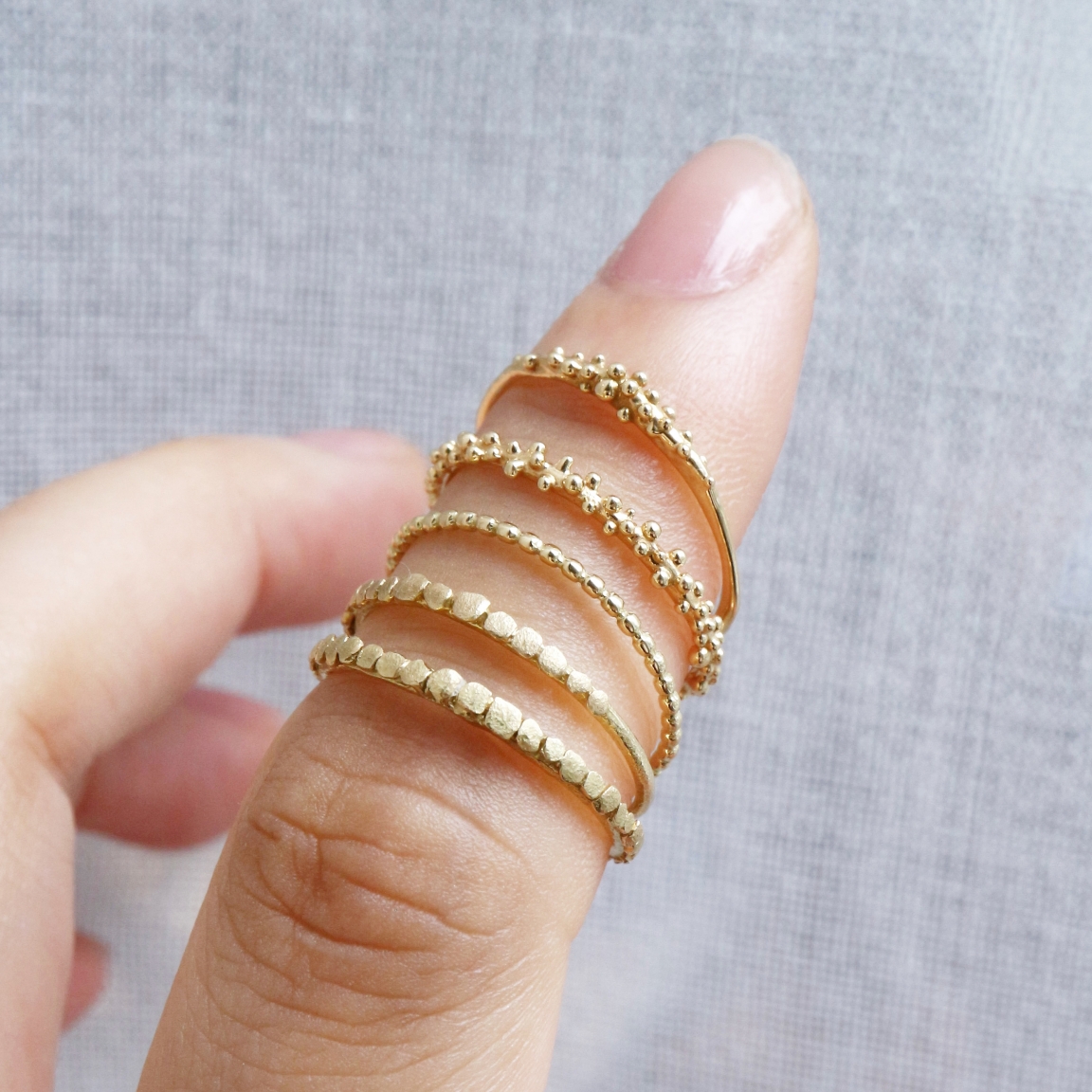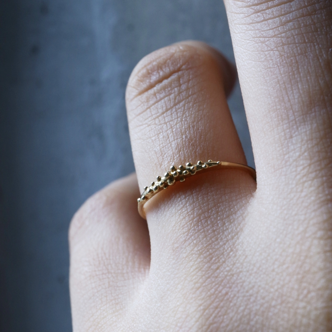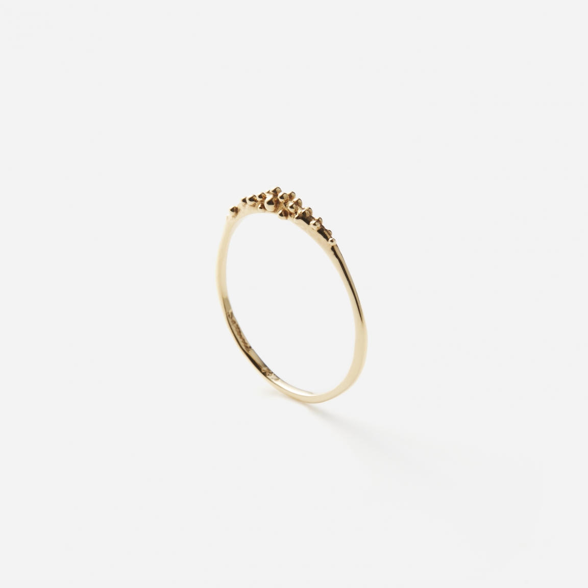 大きさ違いのゴールドの粒をトップに施し、地金のみで露のしずくを表現したDelicate Dewdrop Bandリング。