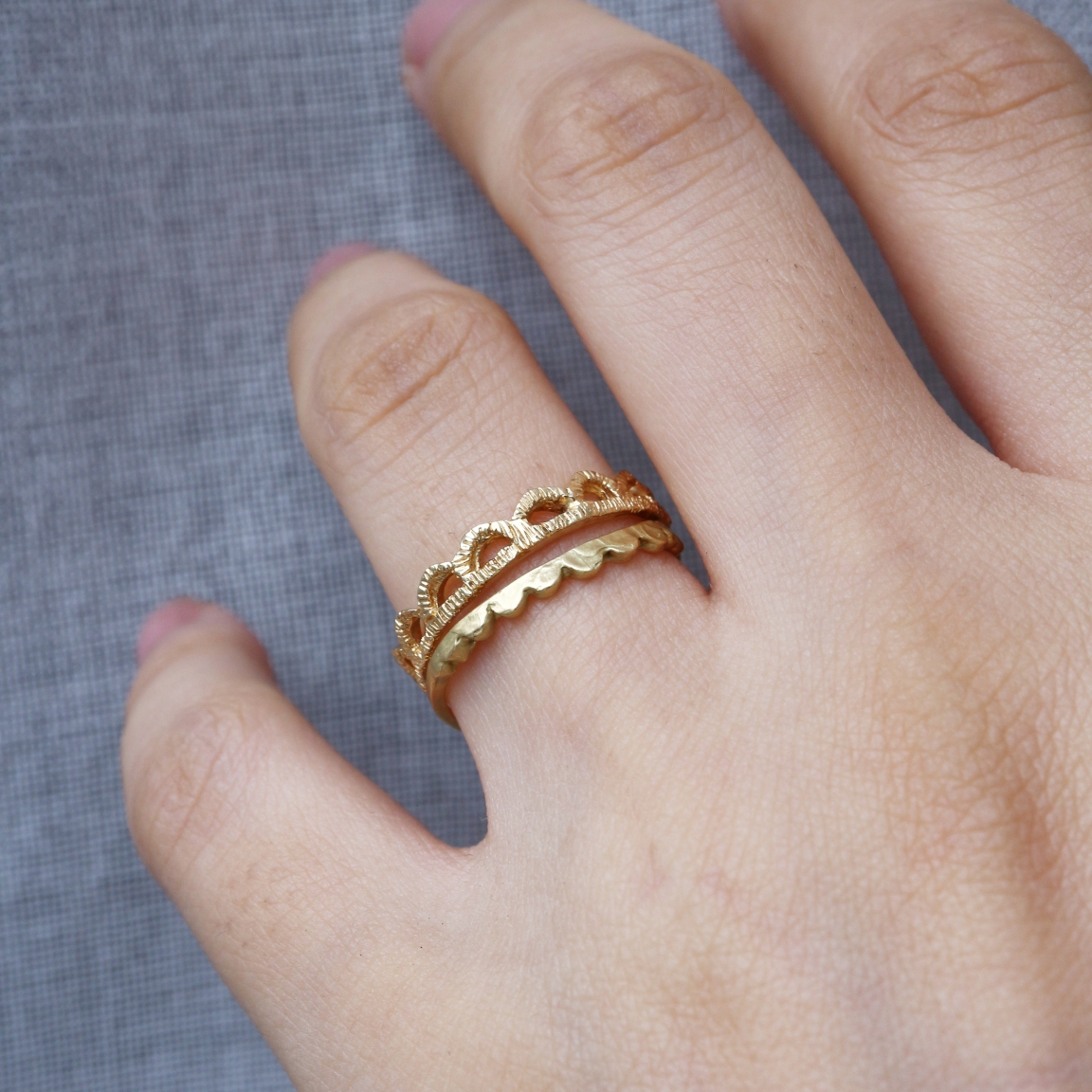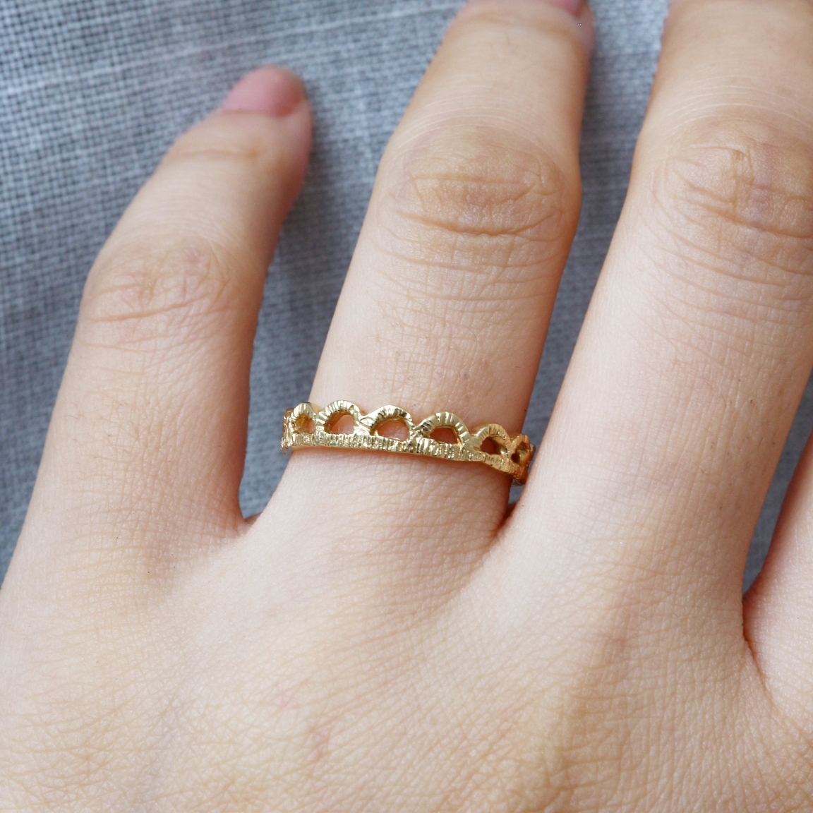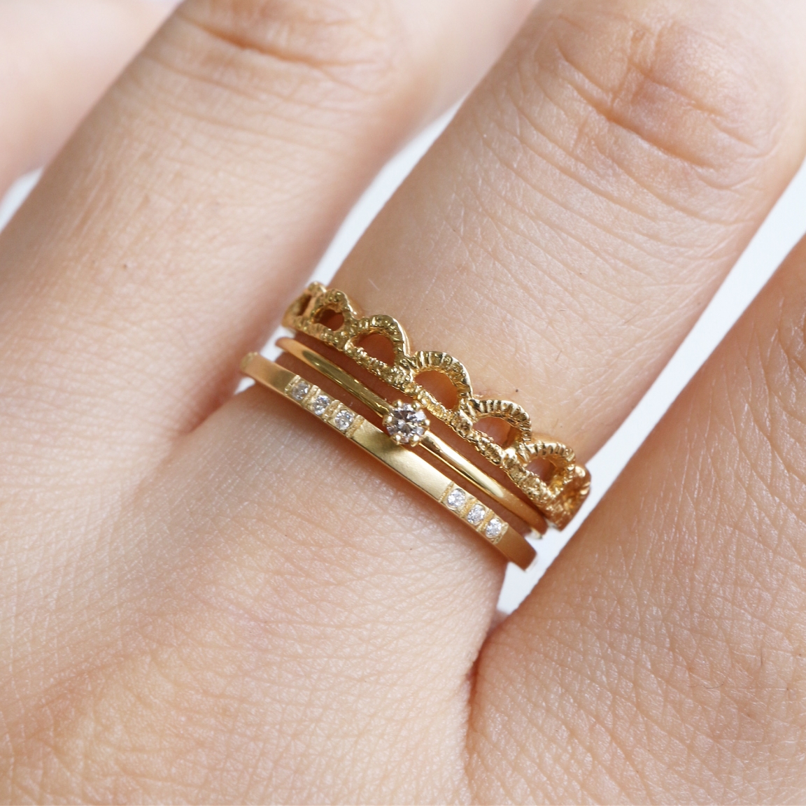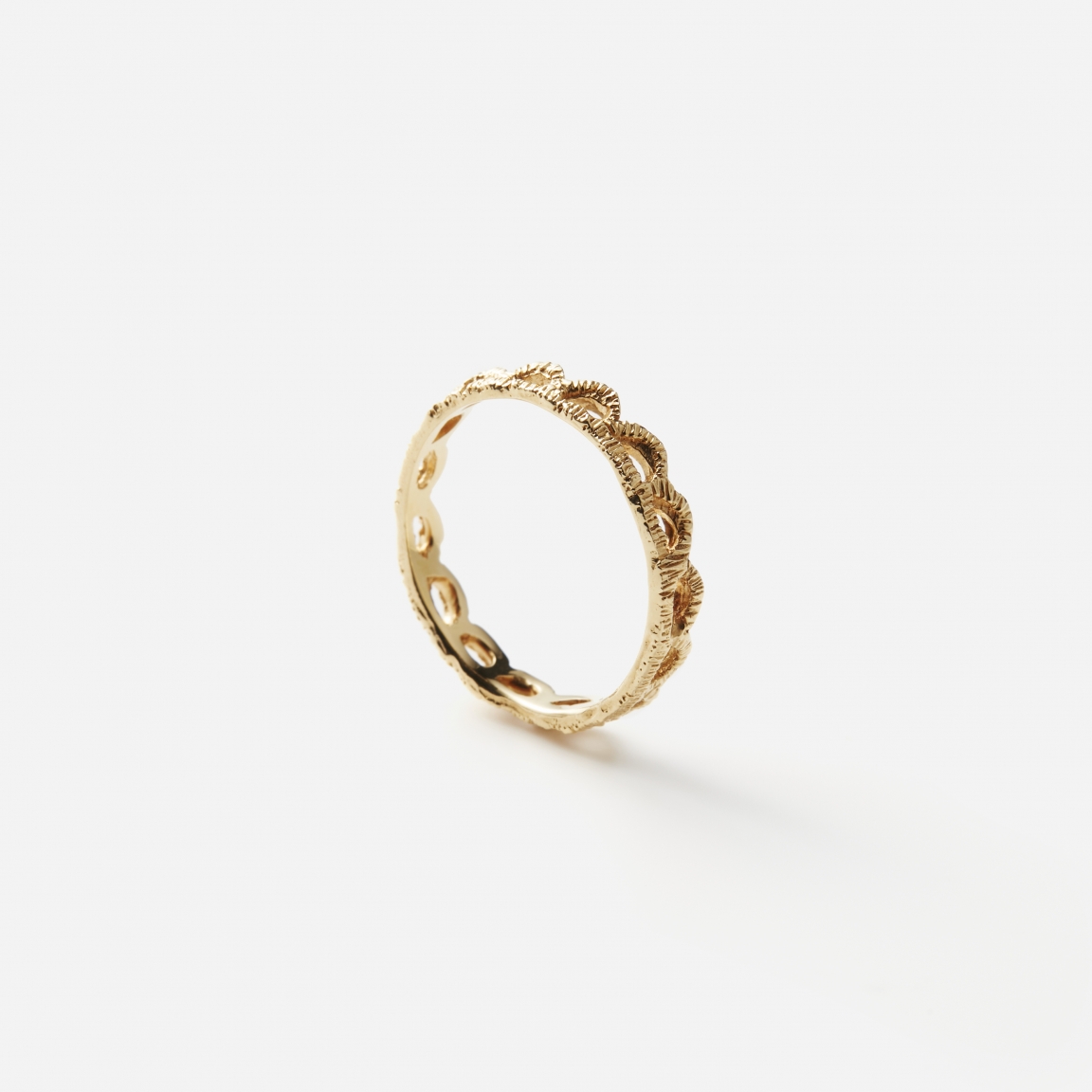 英語で帆立貝を意味し、「スカラップ」という半径型の丸い縁取りモチーフを地金で表現したLace Scallop Ring。表面にはテクスチャーが施され、金属でありながらも、透かし模様の質感やレースの柔らかい生地感が伝わってくる繊細なデザインです。