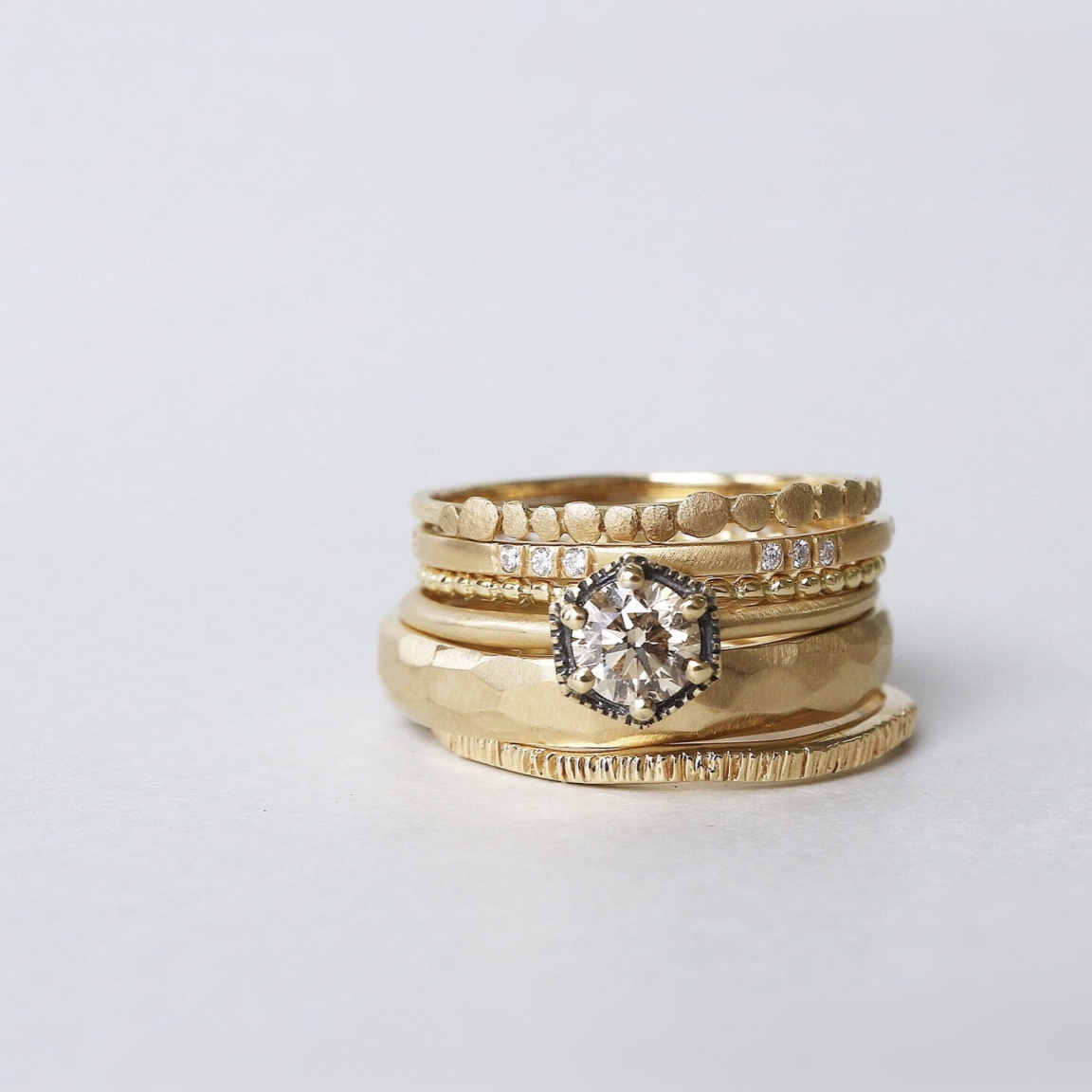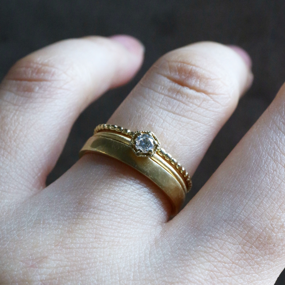リングを数本重ね付けされる方におすすめのデザイン。一本持っているとコーディネートの中に新しいアクセントを生み出してくれるリングです。