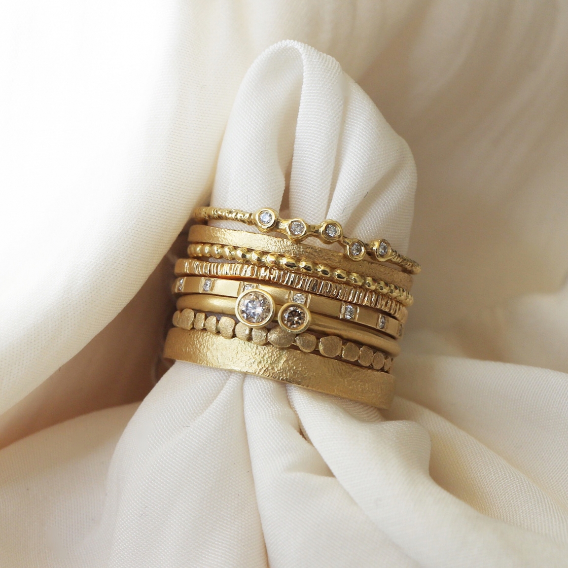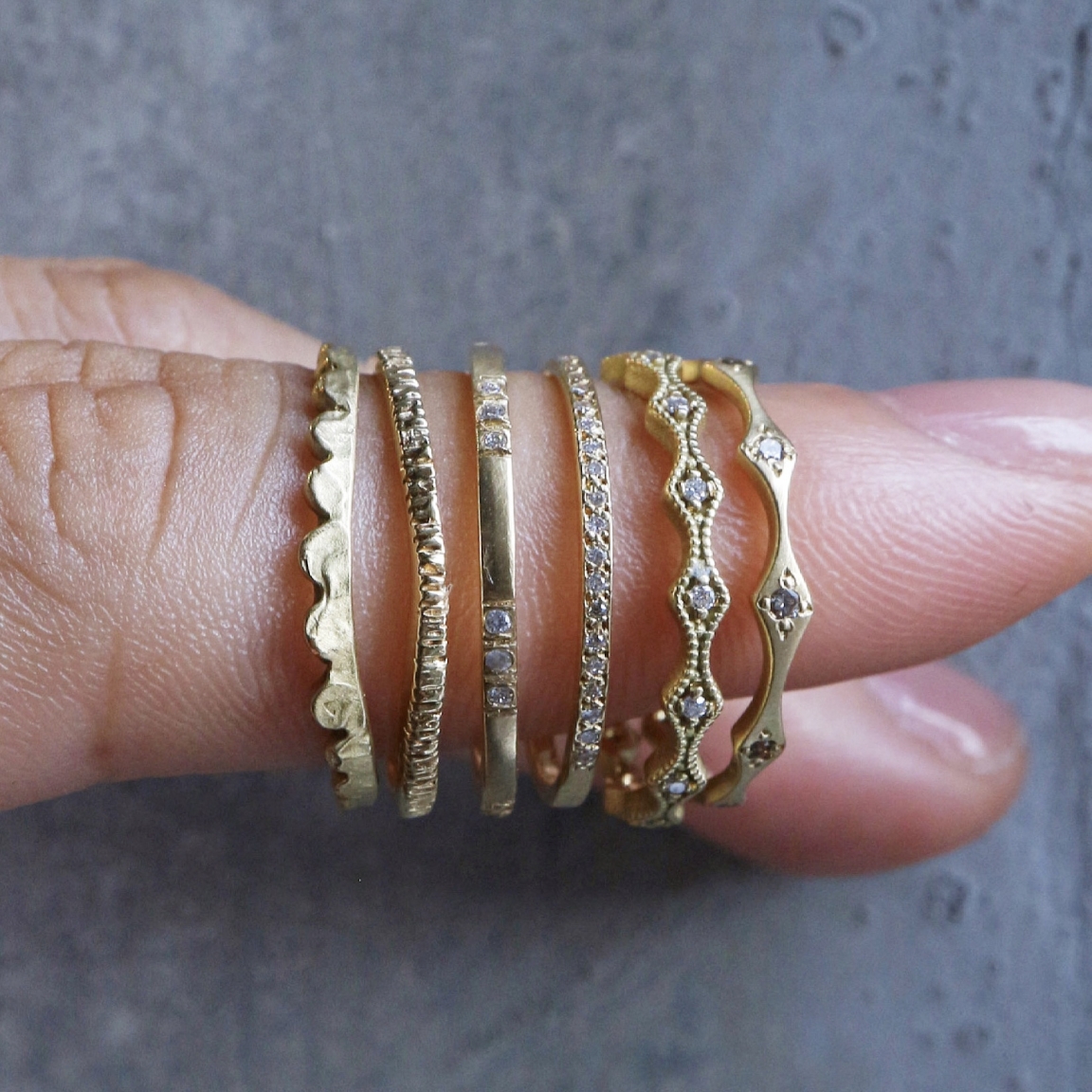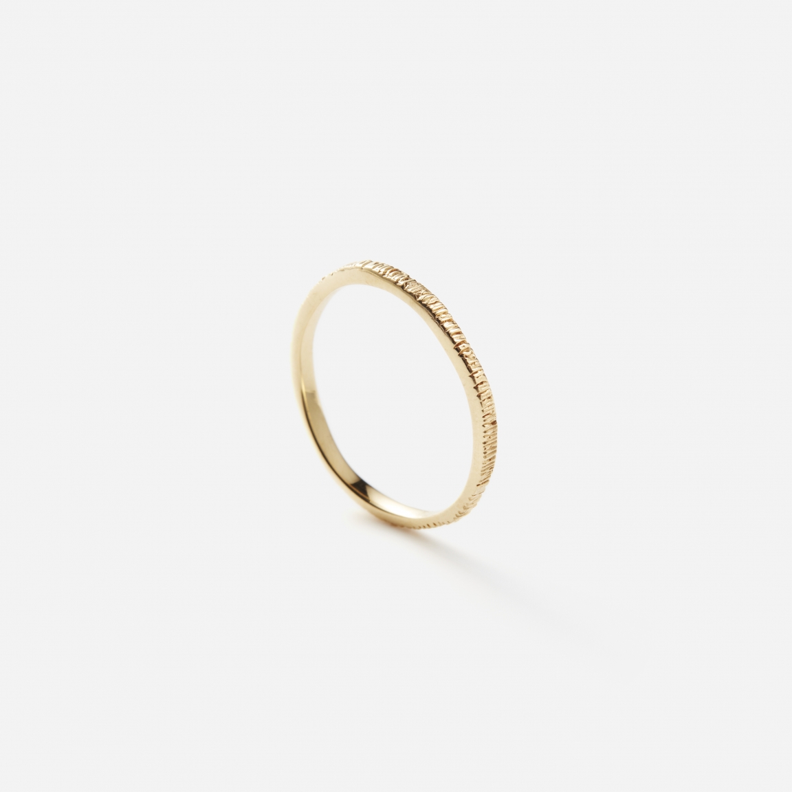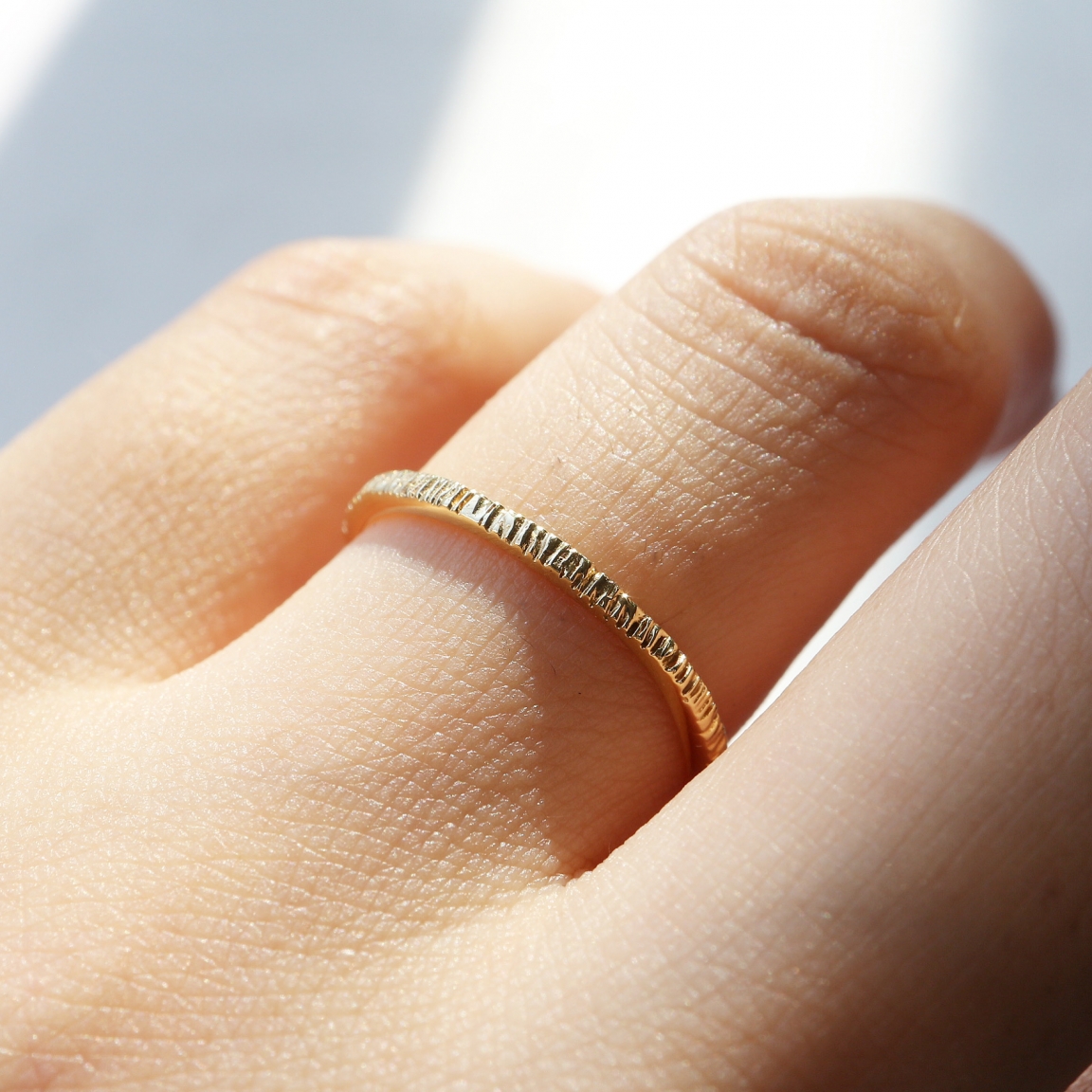 手作業で丁寧に彫られたテクスチャーによって生み出されるのは、ゴールドのきめ細やかな輝き。平板でなく、凹凸部分に光があたることによって、地金特有の陰影ある表情が見られます。