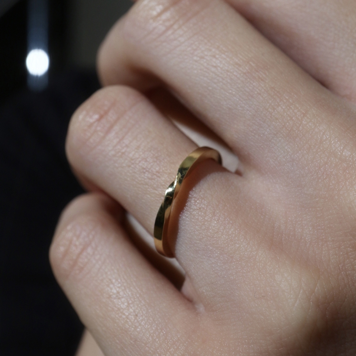 たおやかな捻りをきかせ、エッジの美しさを引き立てたデザインは、シンプルながらも指元に美しい陰影を生む上品な仕上がり。3種のゴールドとプラチナからお選びいただけます。