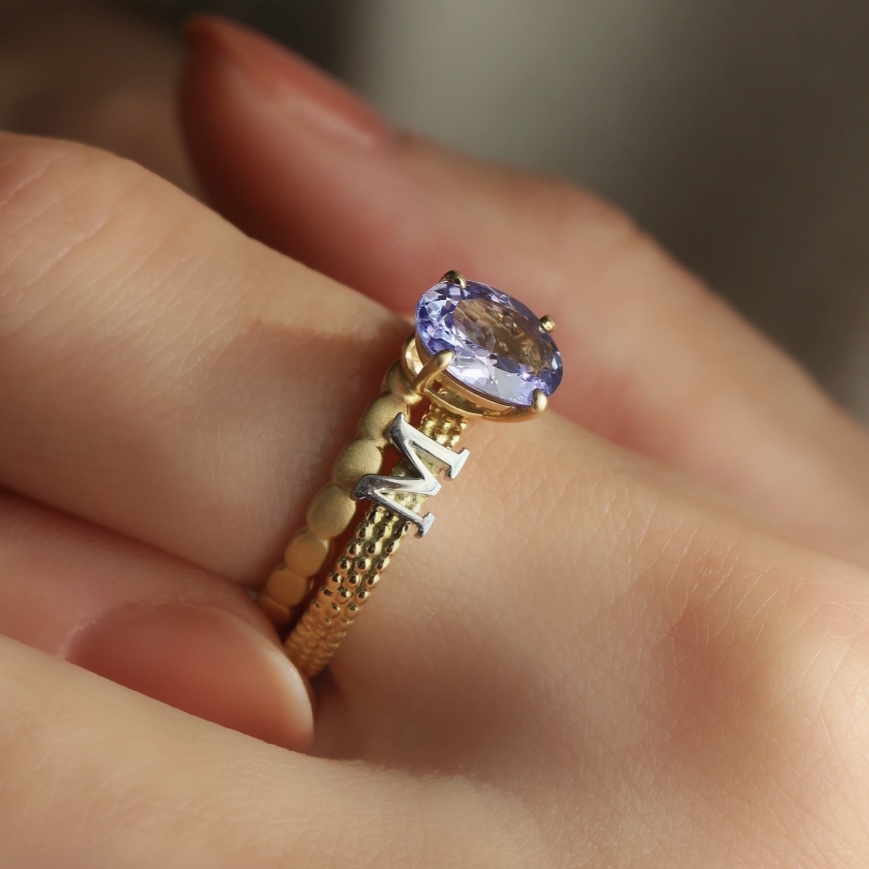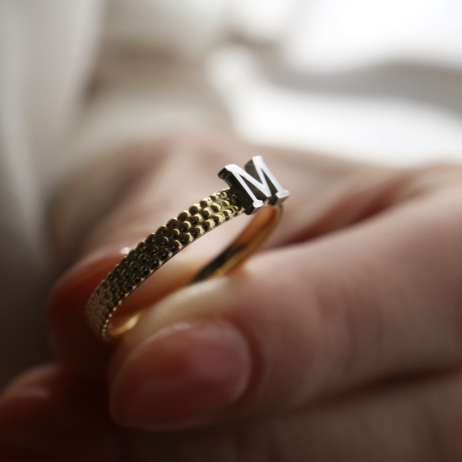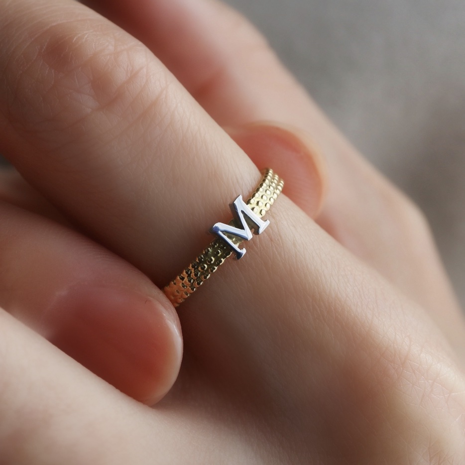イニシャルはお好きな一文字をセミオーダーにて承ります。ご自身のお名前はもちろん、パートナーやお子さんなど大切な方のお名前から一文字、心にとどめておきたい言葉から一文字、など想像するだけで選ぶのが楽しくなりそうですね。