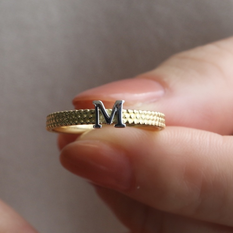 一つは持っておきたいイニシャルモチーフのジュエリー。こちらは、イニシャルはPt900、そしてアームはK18YGで仕立てた品の良いコンビネーションのリングです。