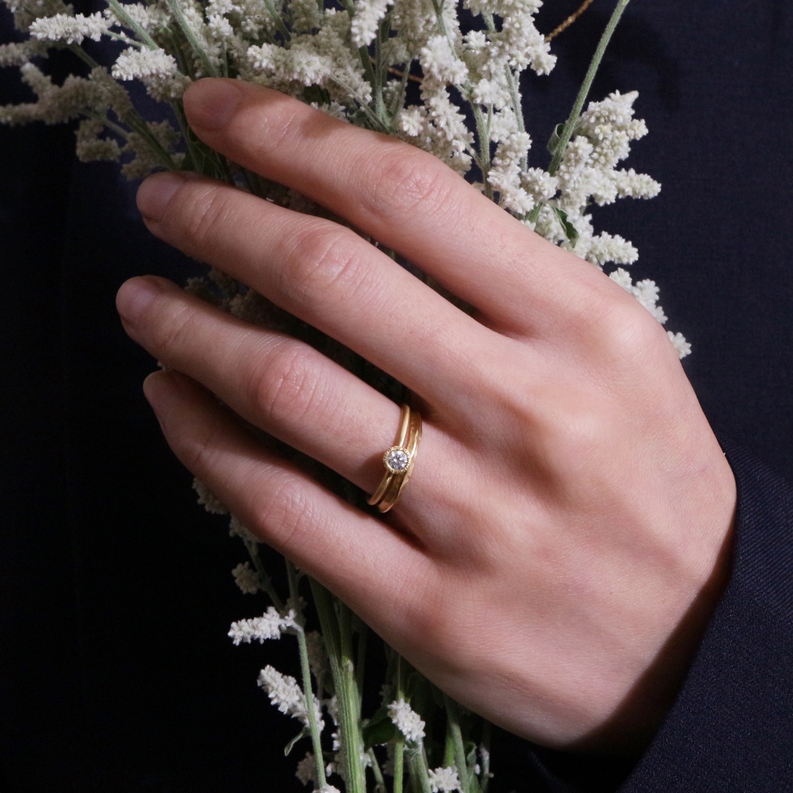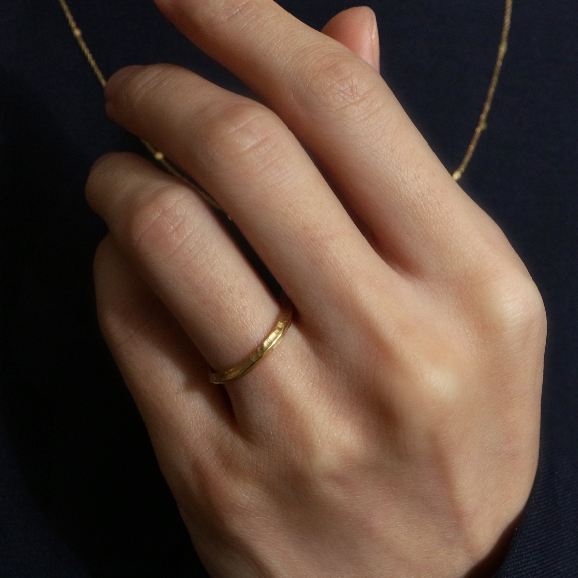 地金特有の陰影から生み出される優しい光は、マットな風合いも相まって、アンティーク感もある落ち着いた印象を醸し出しています。