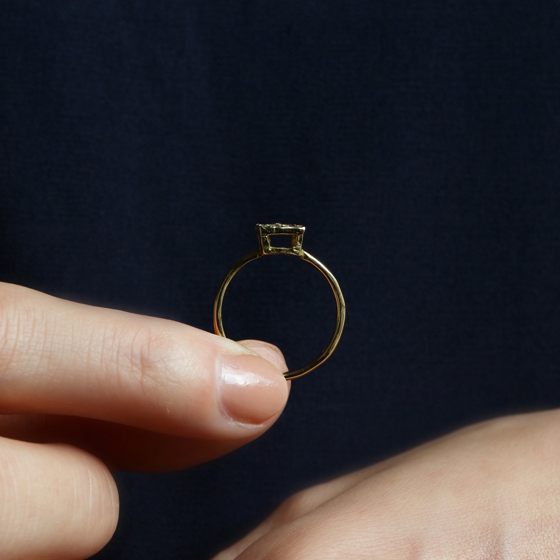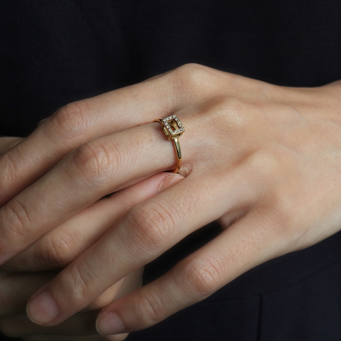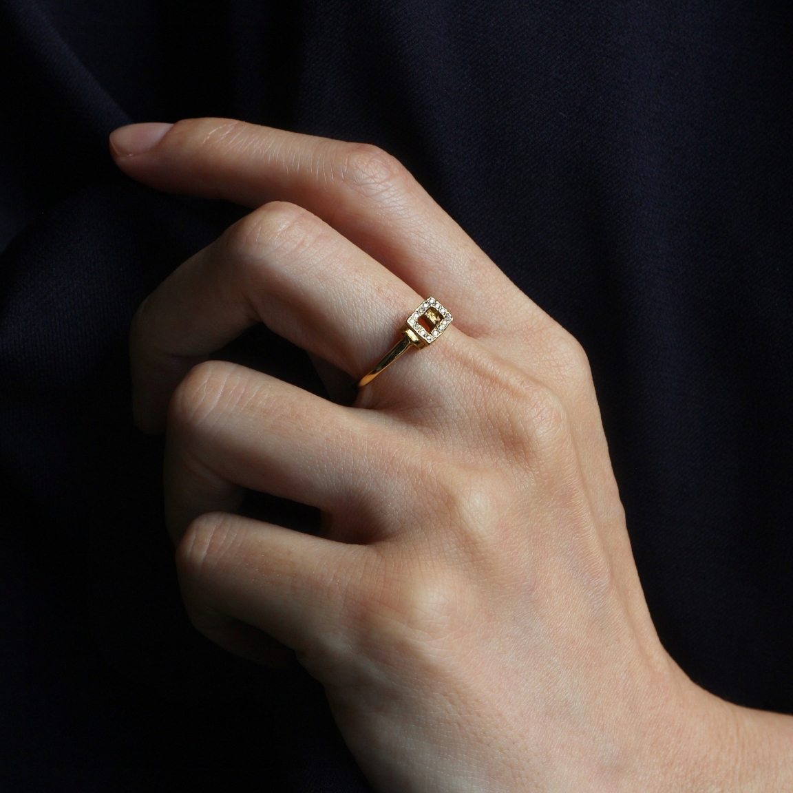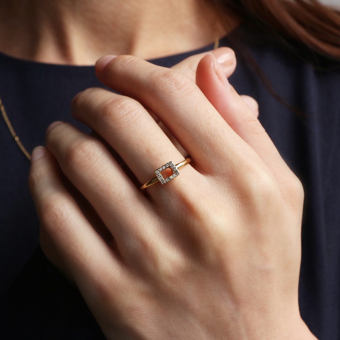 ボックス型のモチーフは、空間と高さを持たせることでよりその存在感が引き出され、ライン上に施された繊細なダイヤモンドの輝きと相まって、上品かつシャープな佇まいを感じさせられます。お持ちのリングとのコーディネートに1点投入することで、全体のボリュームに良い塩梅の強弱が生まれ、新しいスタイリングの完成です。