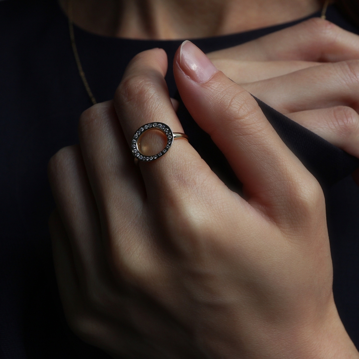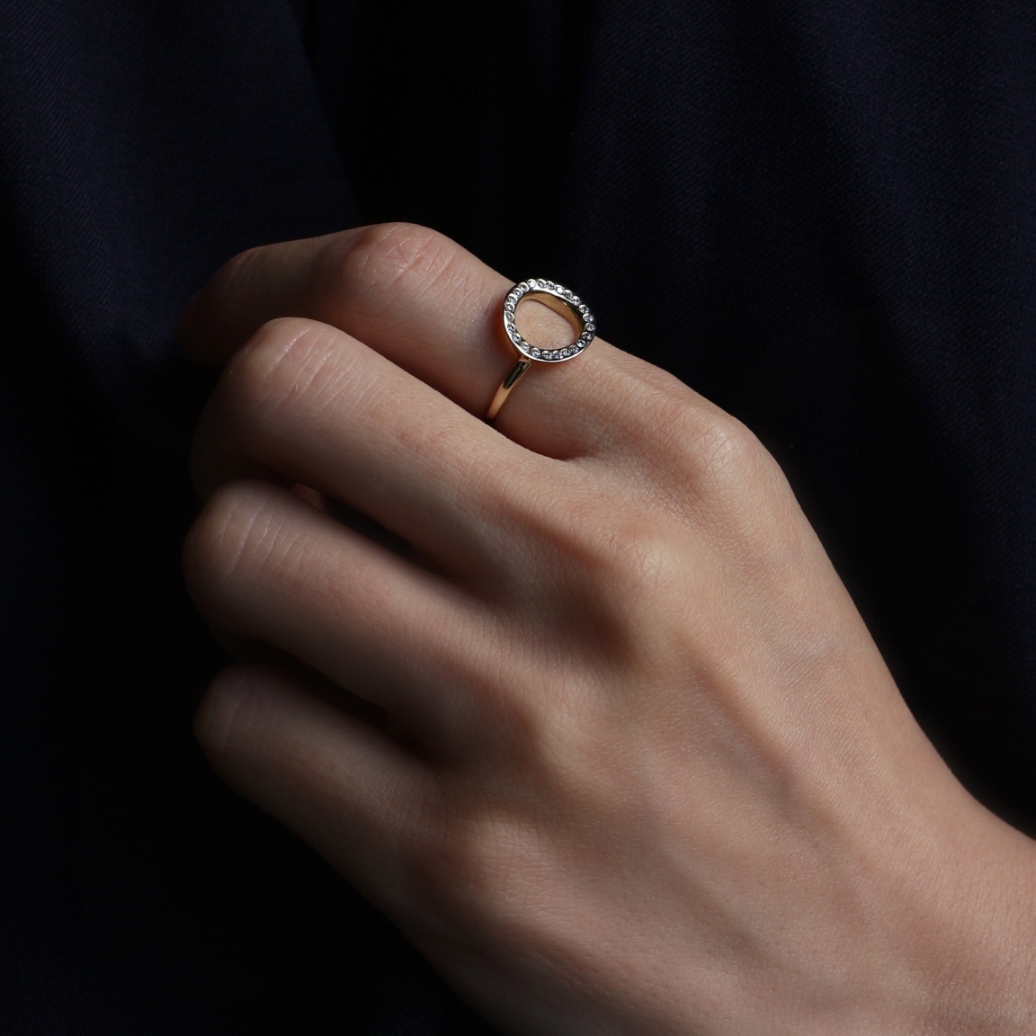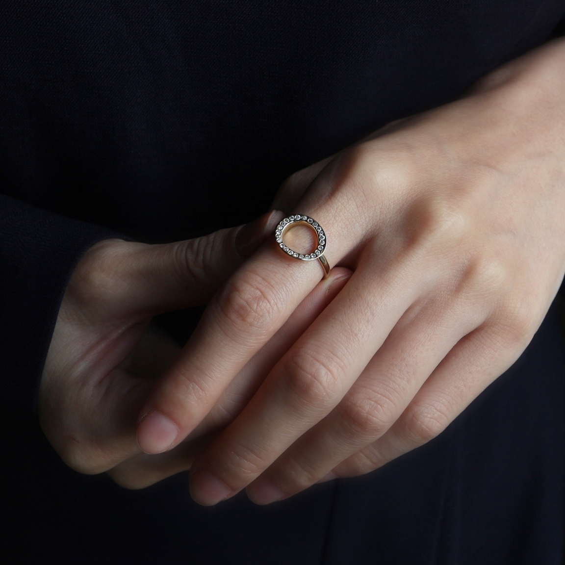 肌を見せる大胆な円環モチーフにダイヤモンドを一周施したデザインは、その広がる空間で一際目を引くボリュームを存分に出しつつも、同時に程良い抜け感を演出しています。ホワイトゴールドの素材使いによって引き立てられる、シックで凛とした表情をお楽しみください。
