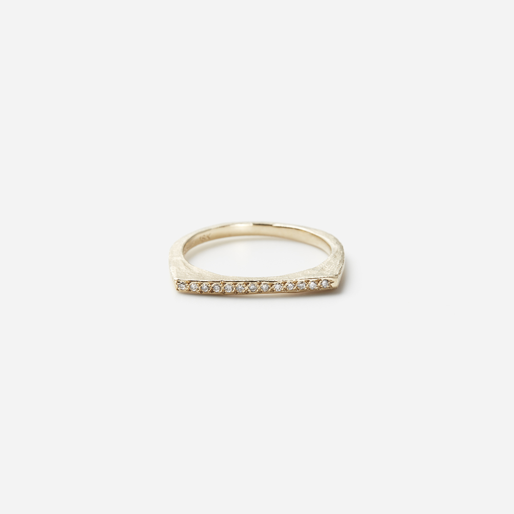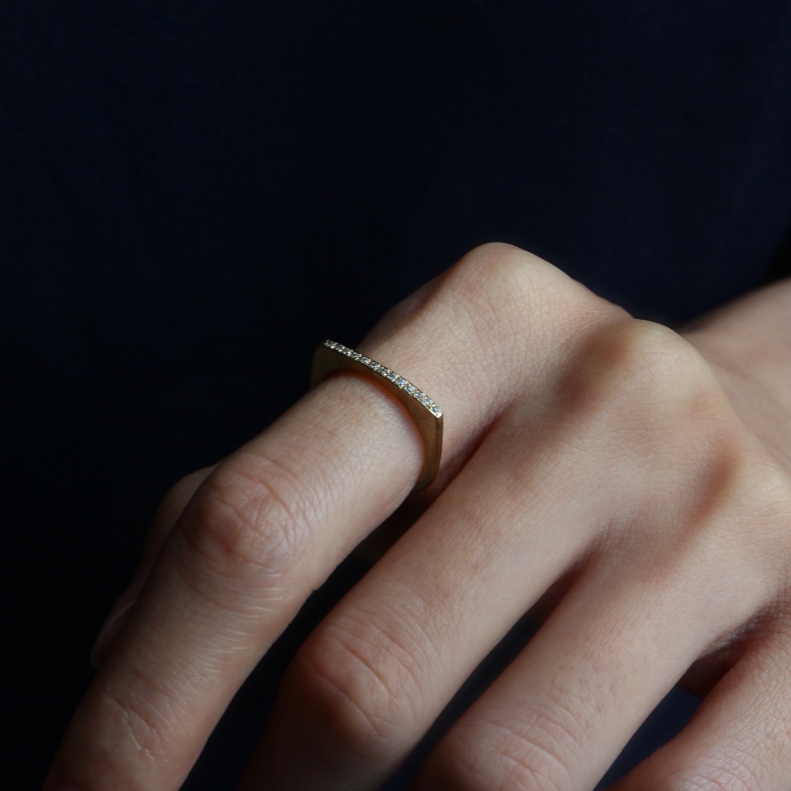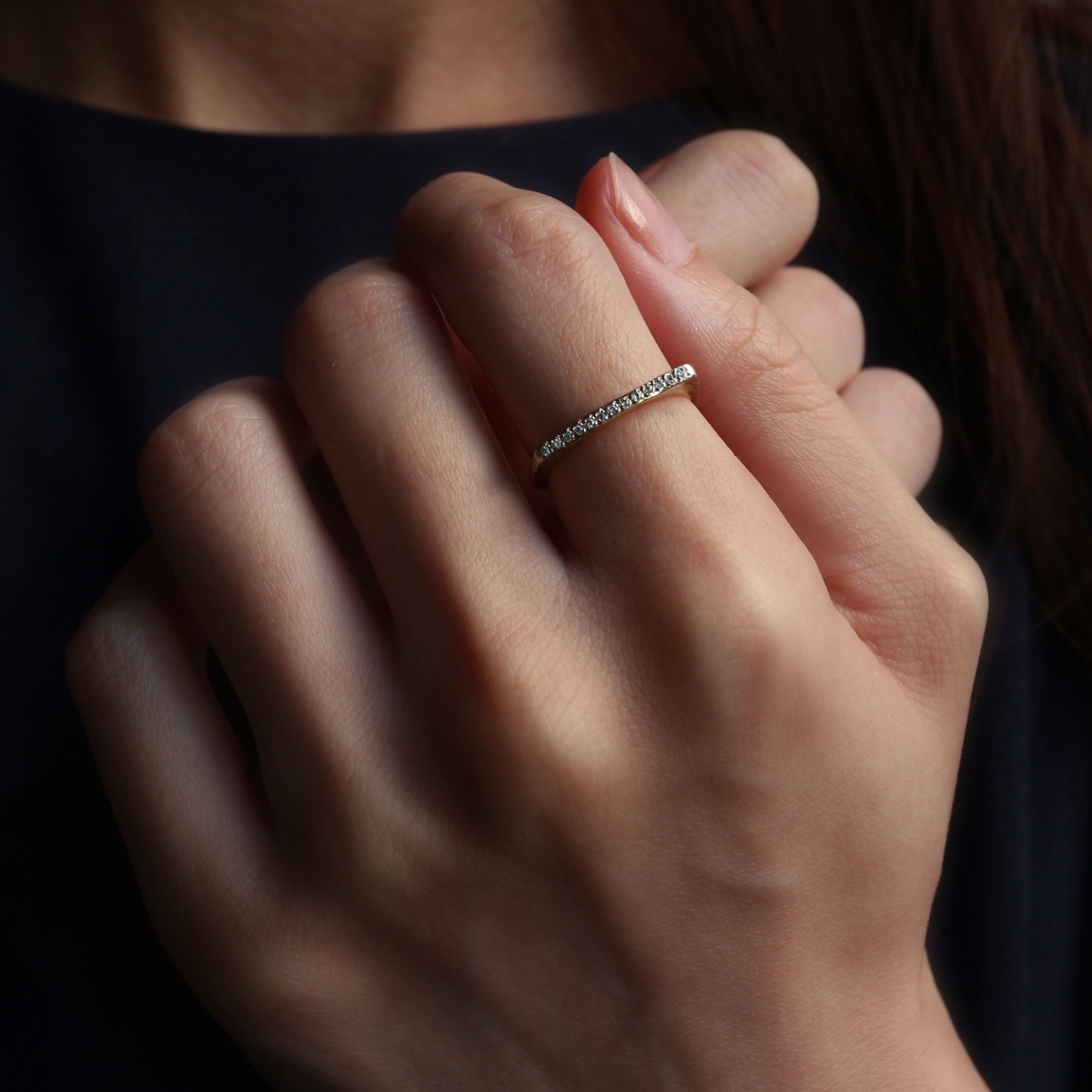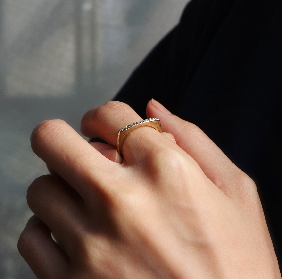 こちらは上部をスクエア型にし、横から見るとアーチのようになったフォルムが印象的なリング。指の上ではダイヤモンドが整列し、通常の丸い形状とは異なり、まっすぐと伸びるラインがシャープさを一層引き立てます。正面と横から眺めたフォルム、それぞれ異なる表情をお楽しみください。