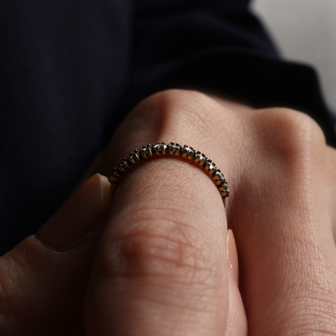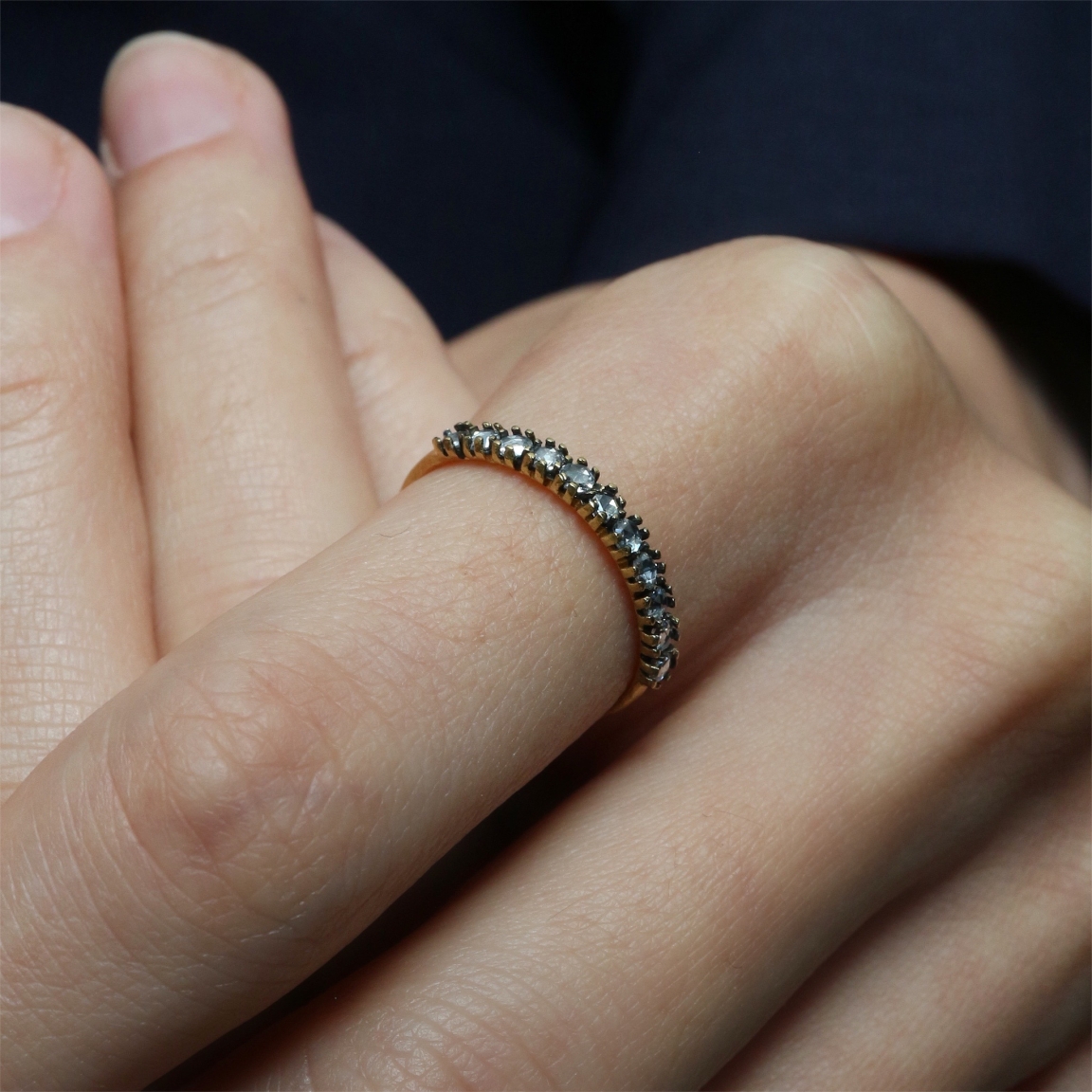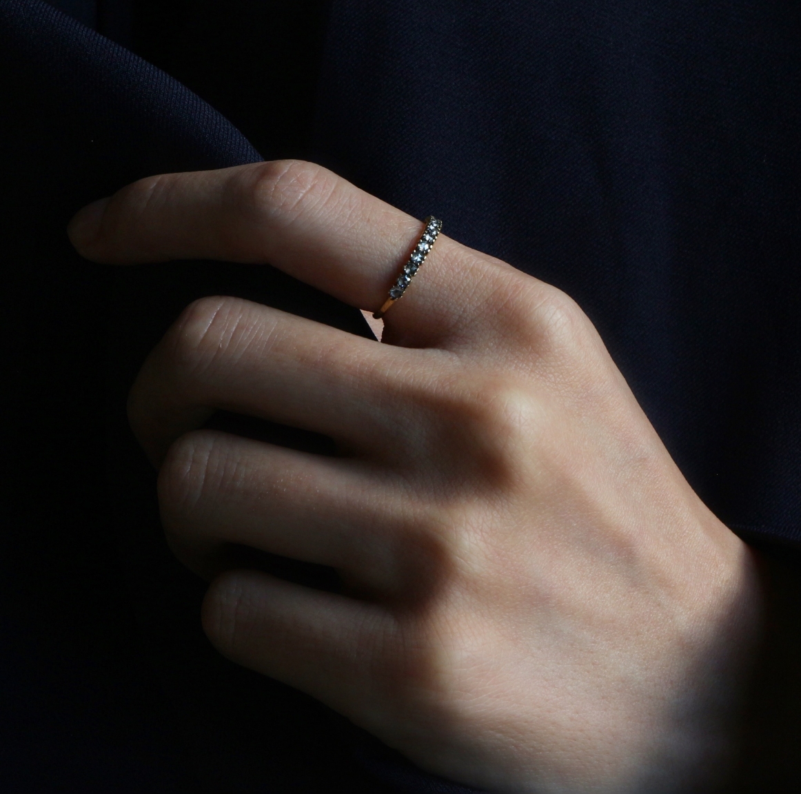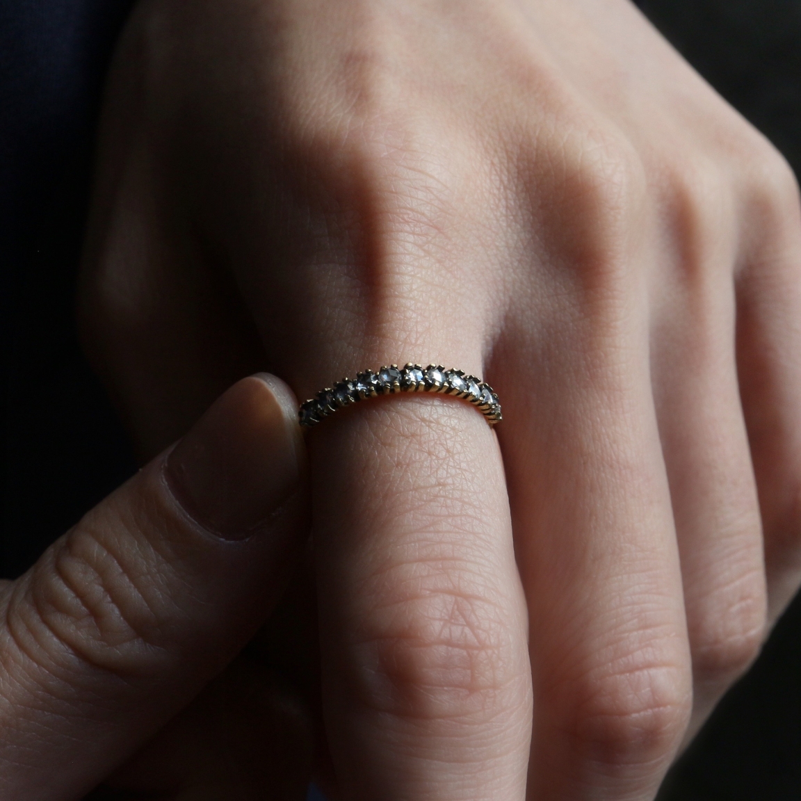 ローズカットを施したホワイトダイヤモンドを半周並べた、ハーフエタニティリング。三角形のファセットが光を反射し、一粒一粒繊細に、そして華やかに煌きます。手作業ならではの爪留めがアンティークな味わいも感じられ、どこか心地よいラフな仕上がりも魅力的です。