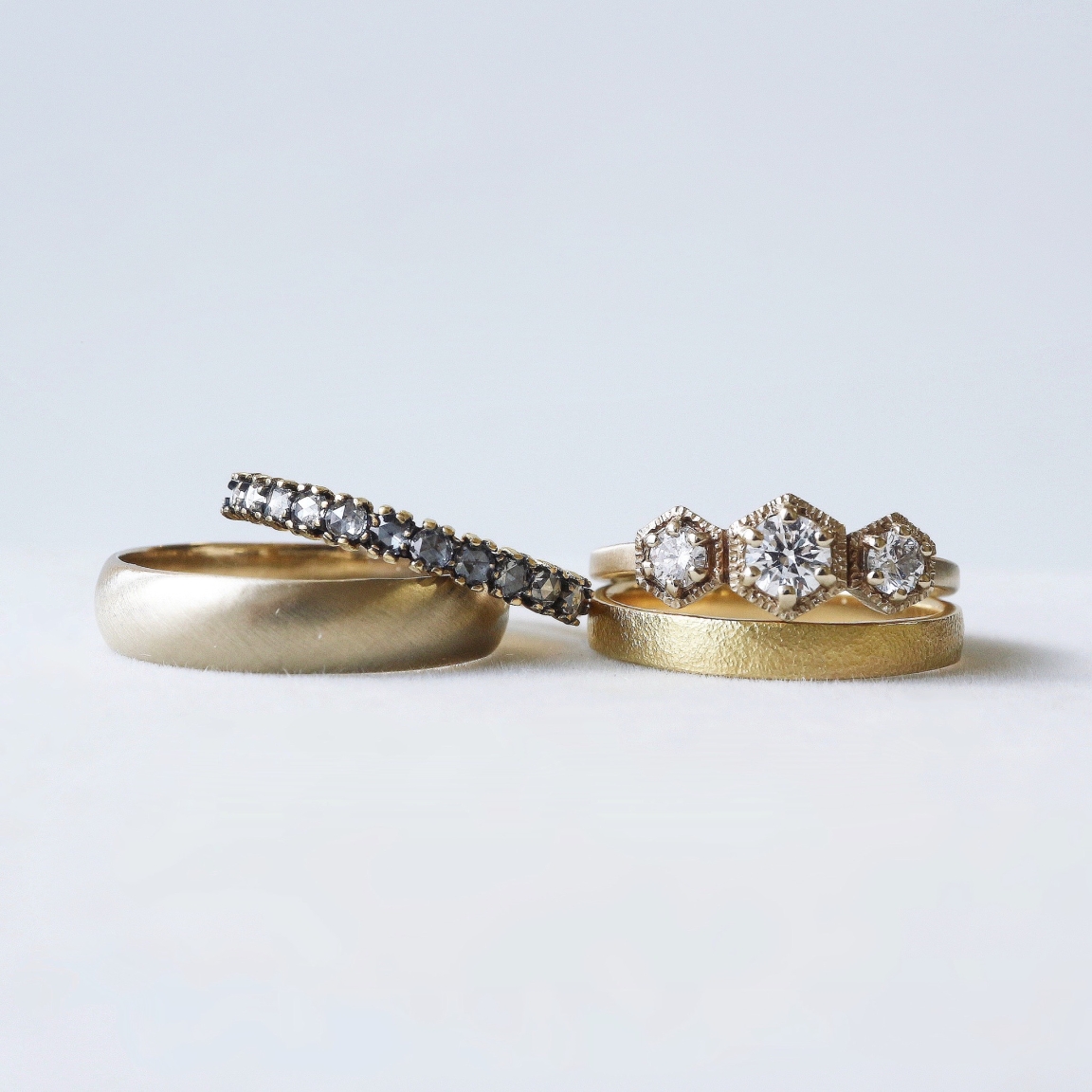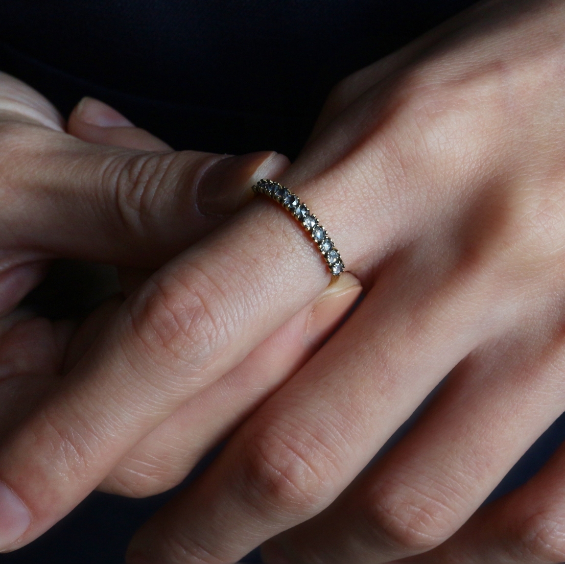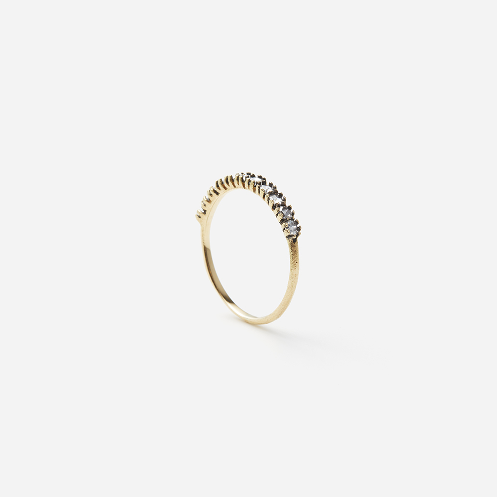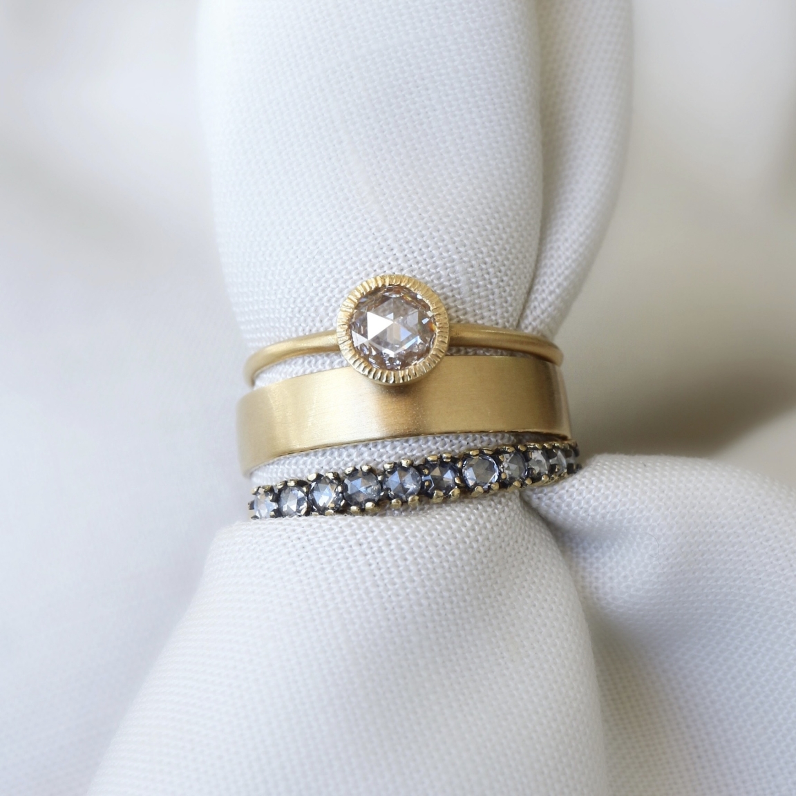 ローズカットを施したホワイトダイヤモンドを半周並べた、ハーフエタニティリング。三角形のファセットが光を反射し、一粒一粒繊細に、そして華やかに煌きます。手作業ならではの爪留めがアンティークな味わいも感じられ、どこか心地よいラフな仕上がりも魅力的です。