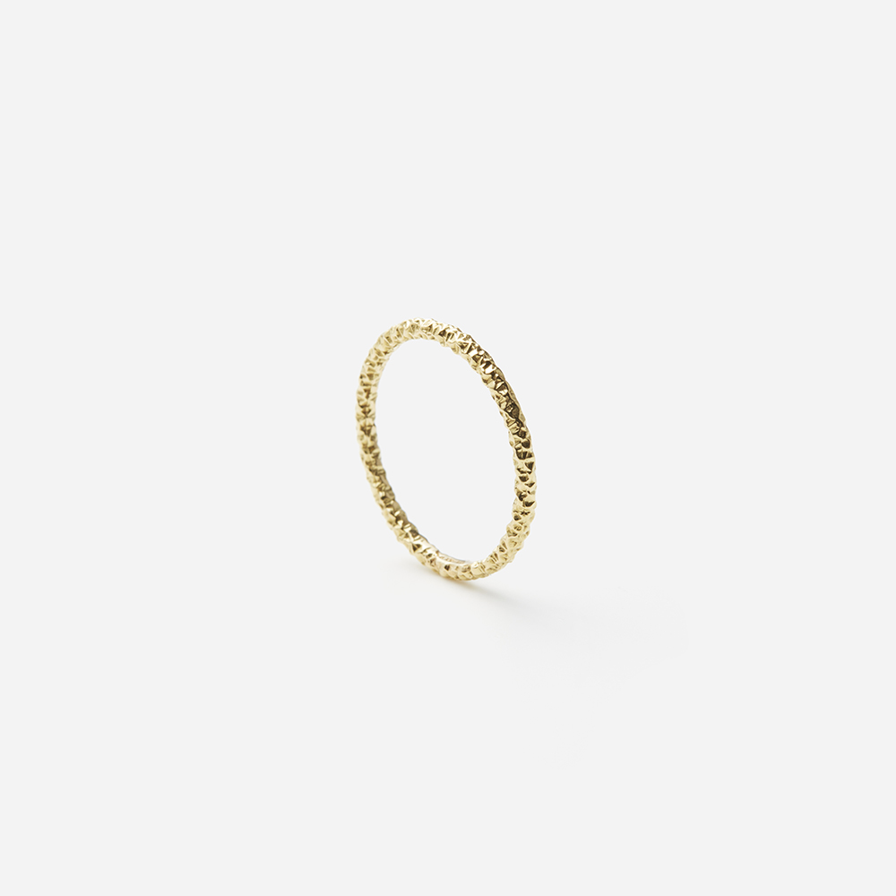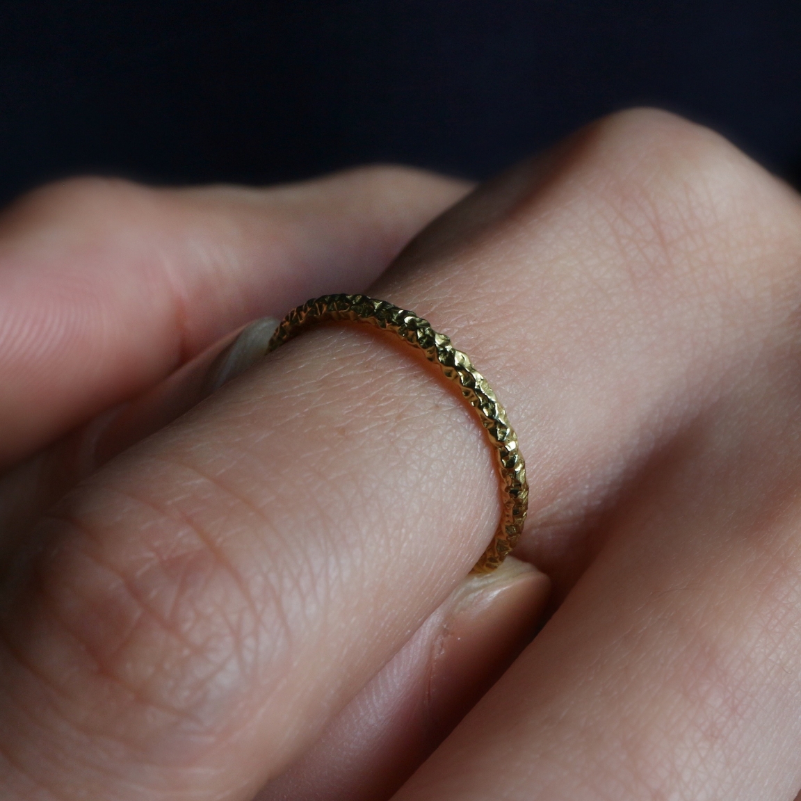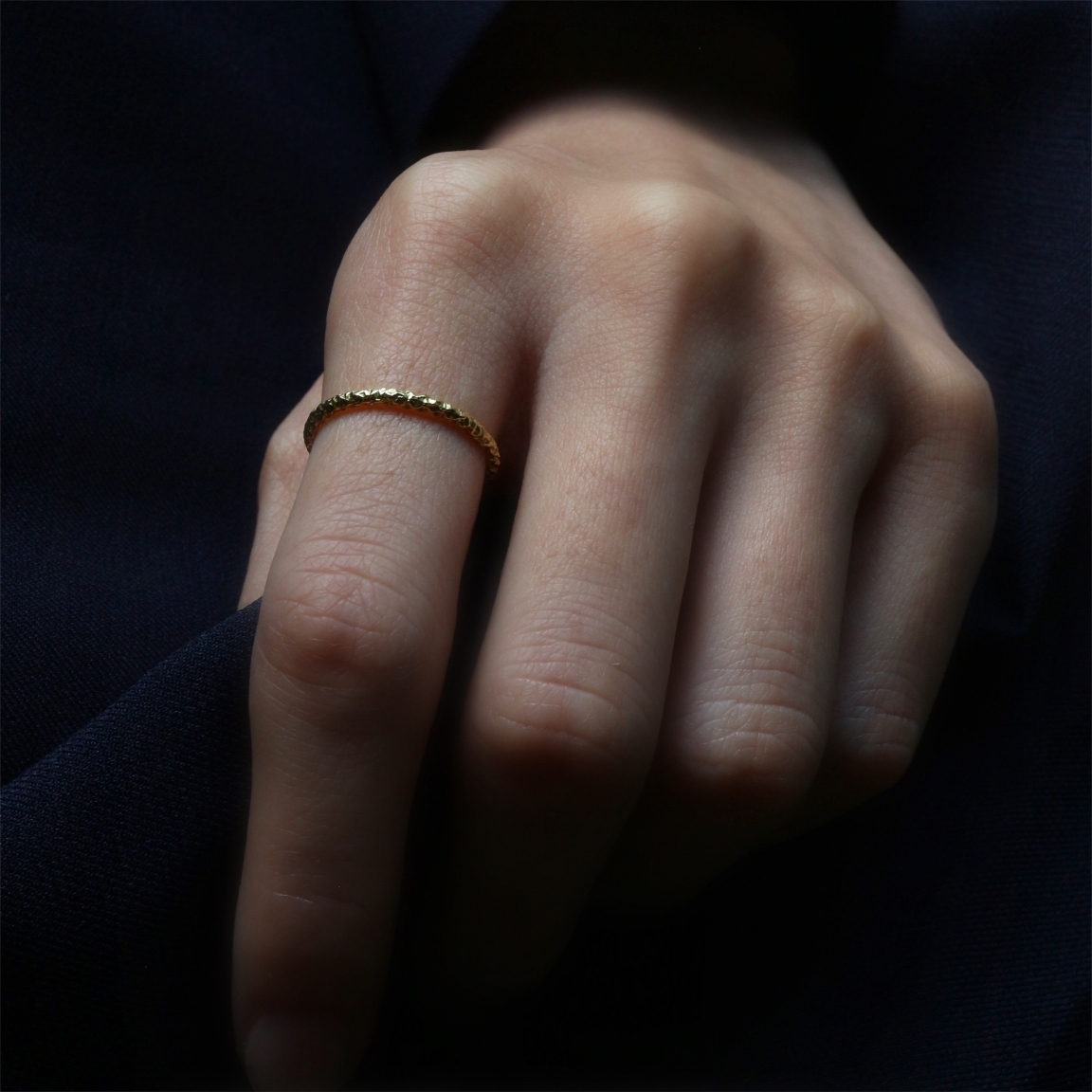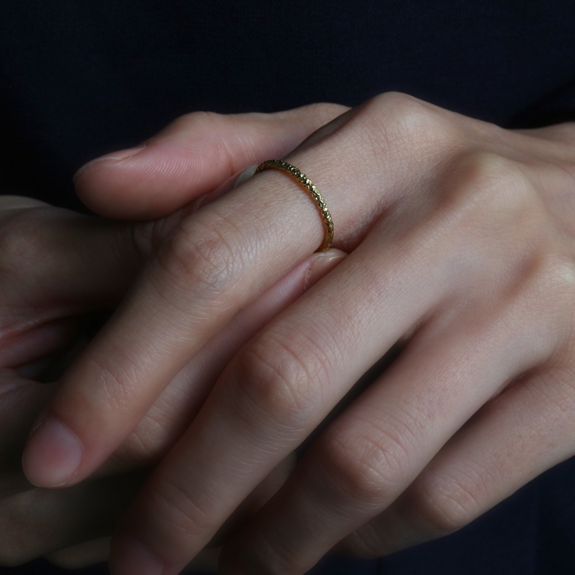 こちらのリングは地金全体にテクスチャーを施し、糸を紡いだような表情が特徴的。凹凸を出した表面は陰影が生まれ、地金ならではの独特な質感を感じられます。