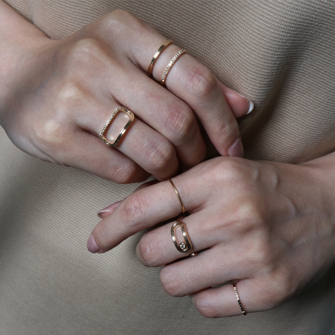 極小のダイヤモンドが放つ優しい煌めきと、彫り込まれたスレッドにより陰影を感じられる艶やかなゴールドが、それぞれ響き合うように指元に華やかな輝きを添えてくれます。