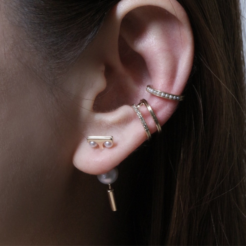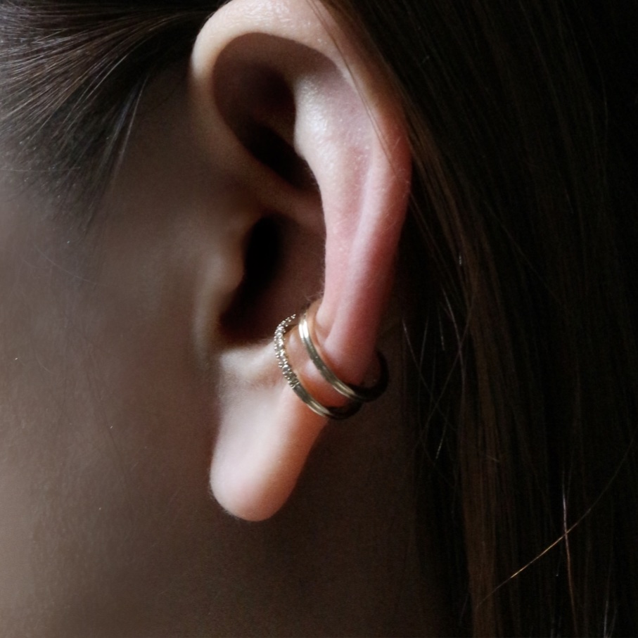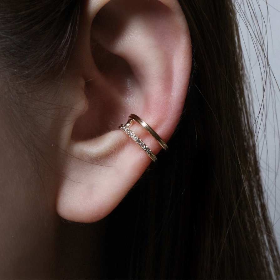 ダイヤモンドとゴールドのダブルラインが美しいパラレルを描く、Gossamerダブルラインイヤーカフ。