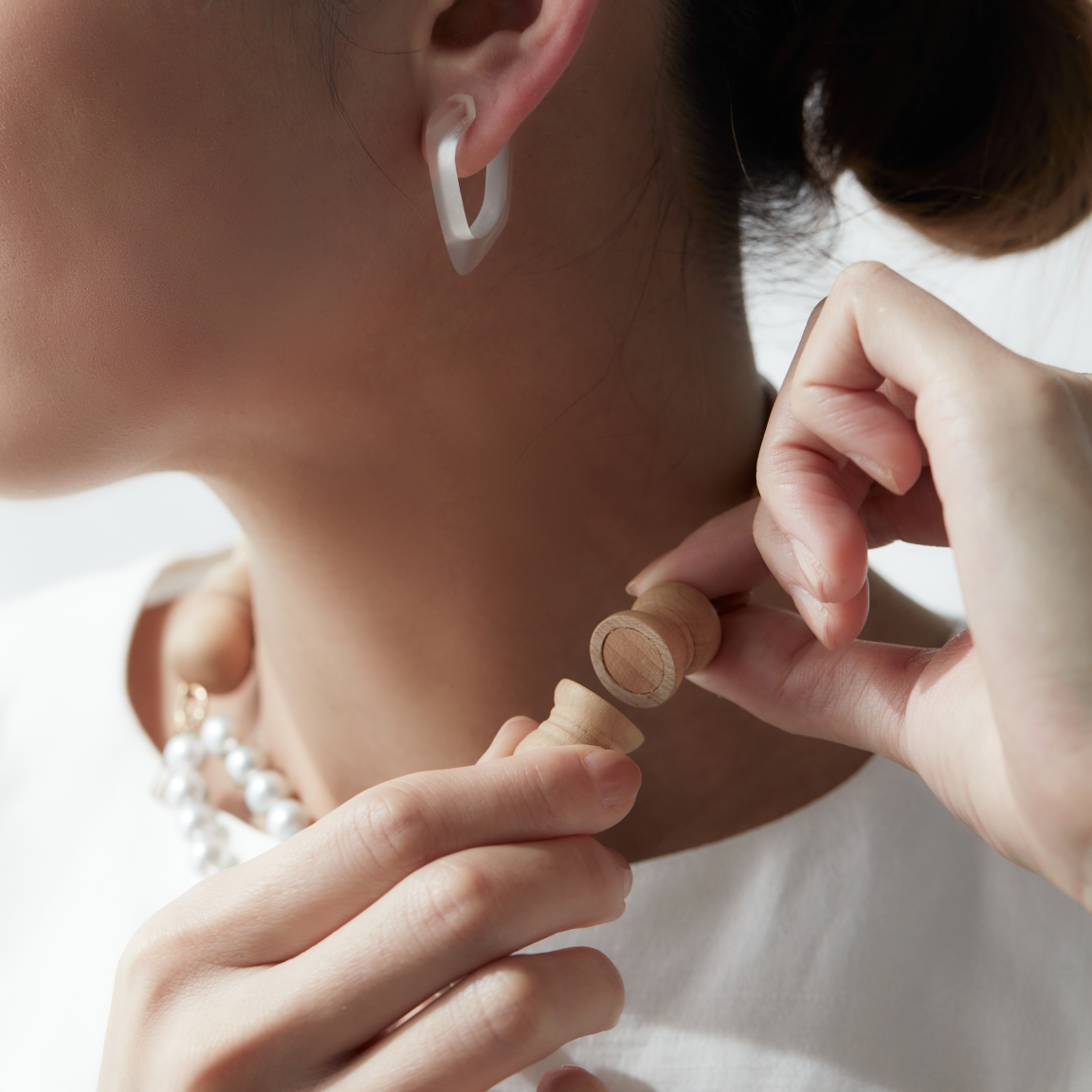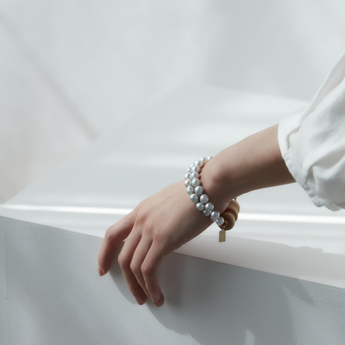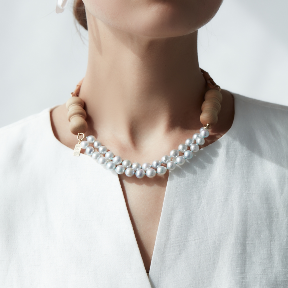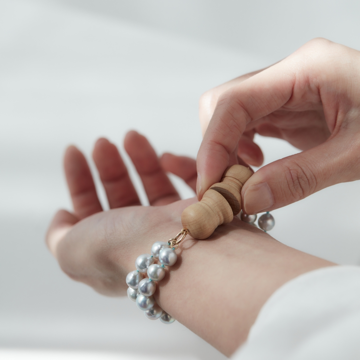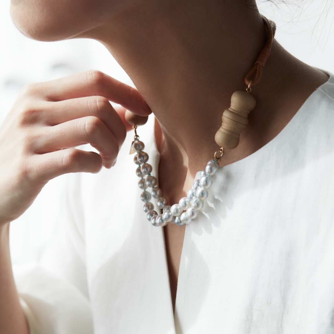 全てをつなげるとネックレスですが、木製のパーツはマグネットが仕込まれたジョイントになっており、外してパール部分のみをつなぐとブレスレットとしてもお楽しみいただけます。