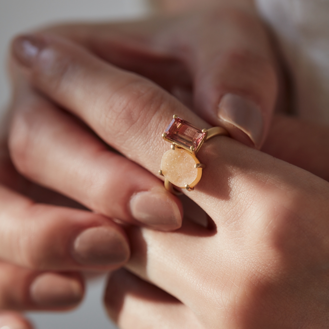 一石でも十分に存在感のある石を、あえて大胆に、贅沢に組み合わせ、指元を覆うほどのボリューム感。大人の余裕と遊び心を存分に感じられるこちらのリングは、着用していると周りの視線を集めること間違いなしです。