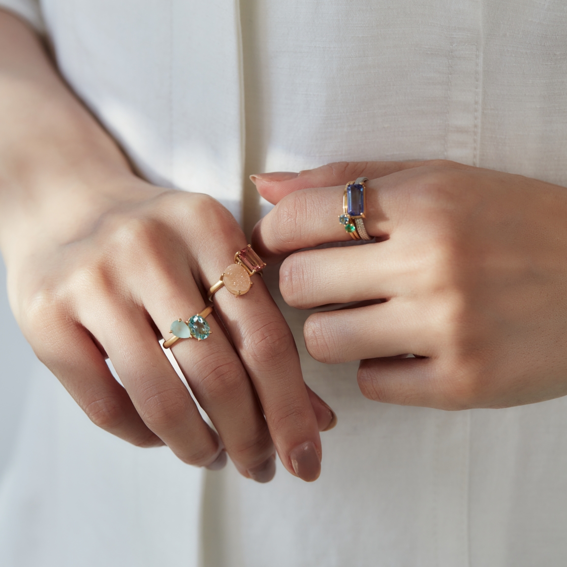 美しい石同士の配色、リズムとバランスにこだわり石の周りの空間全てをトータルでデザインしたTOMOKO FURUSAWA JEWELRYらしいデザインの一点ものリングコレクション。