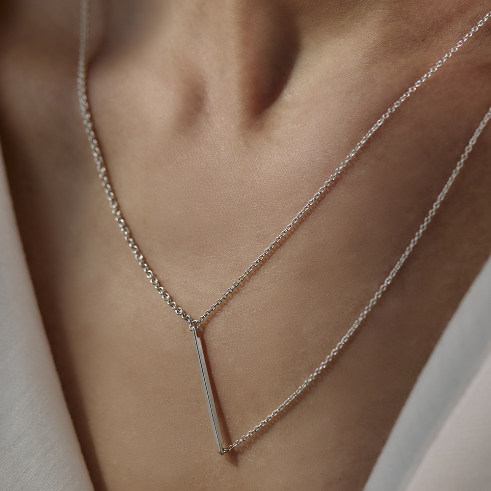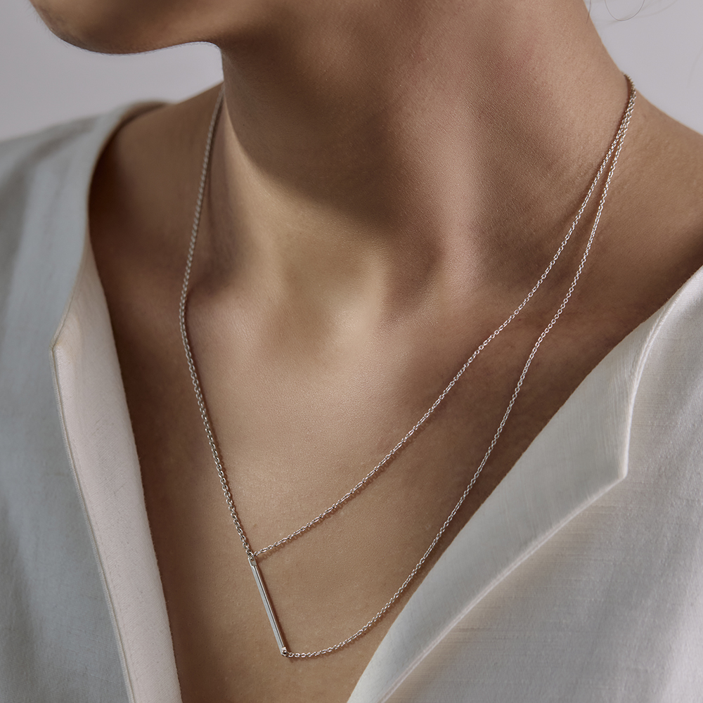 シングルチェーンとダブルチェーンが左右に配置され、それぞれをシルバーのスティックが印象的に繋いでいます。