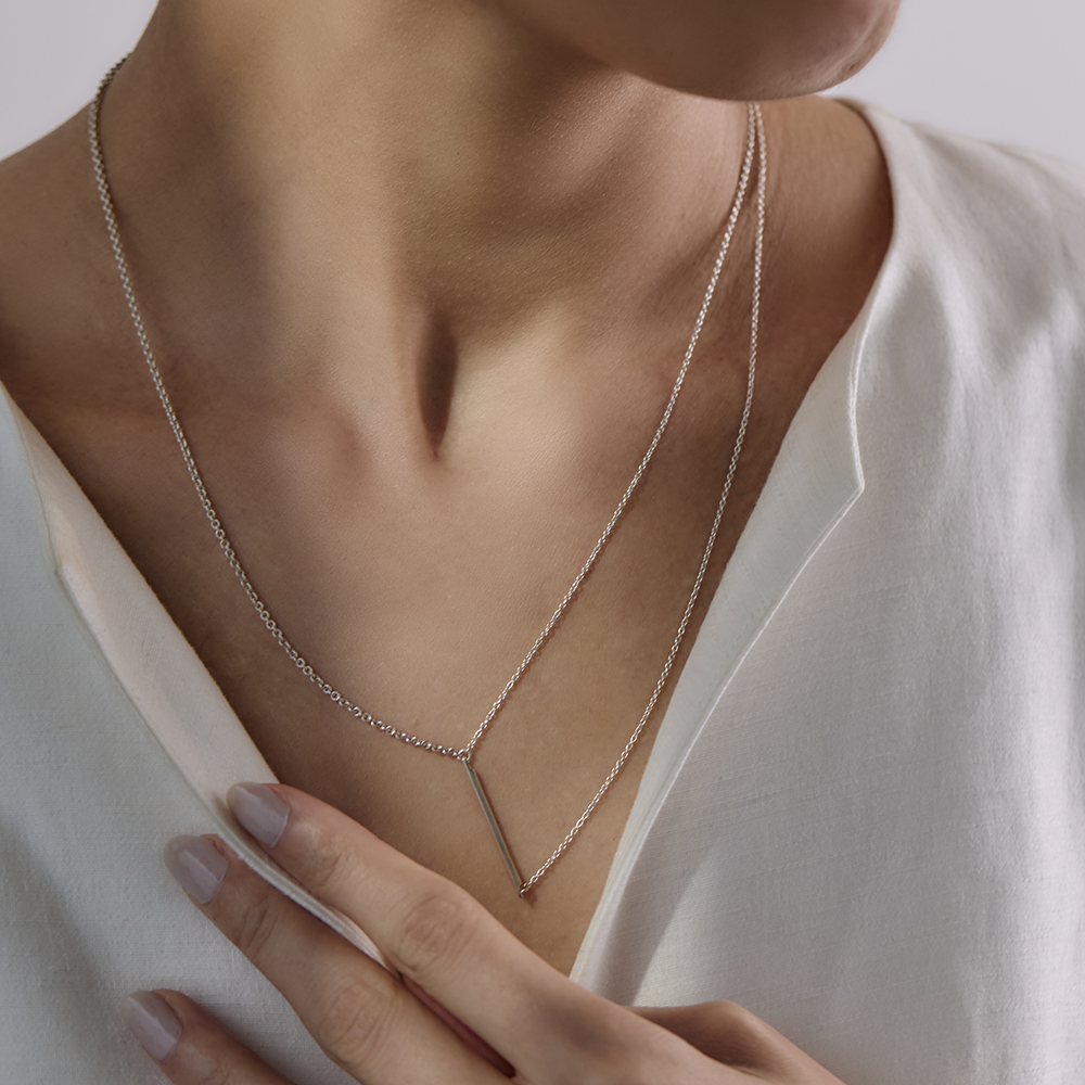 繊細なチェーンが首元に沿う、心地の良い着用感。チェーンのなす曲線とシルバーの直線が、それぞれ胸元で美しい陰影を生み出す、独特なデザインが目を惹きます。